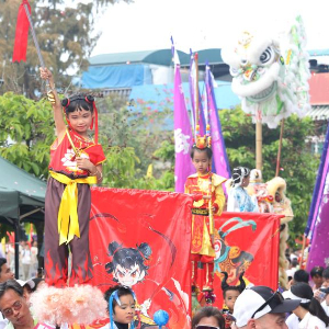 身着华丽戏服的小孩高高“悬”在空中,或巧妙地站在一片芭蕉叶上,或坐在小船里在“湖”中飘荡,表演者从容淡定,在人群惊呼声中挥洒自如。这不是杂技表演,而是正在进行的太平清醮重头戏“飘色会景巡游”。