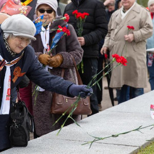 5月8日,在俄罗斯圣彼得堡谢拉菲莫夫公墓,人们参加献花仪式。
