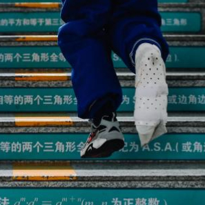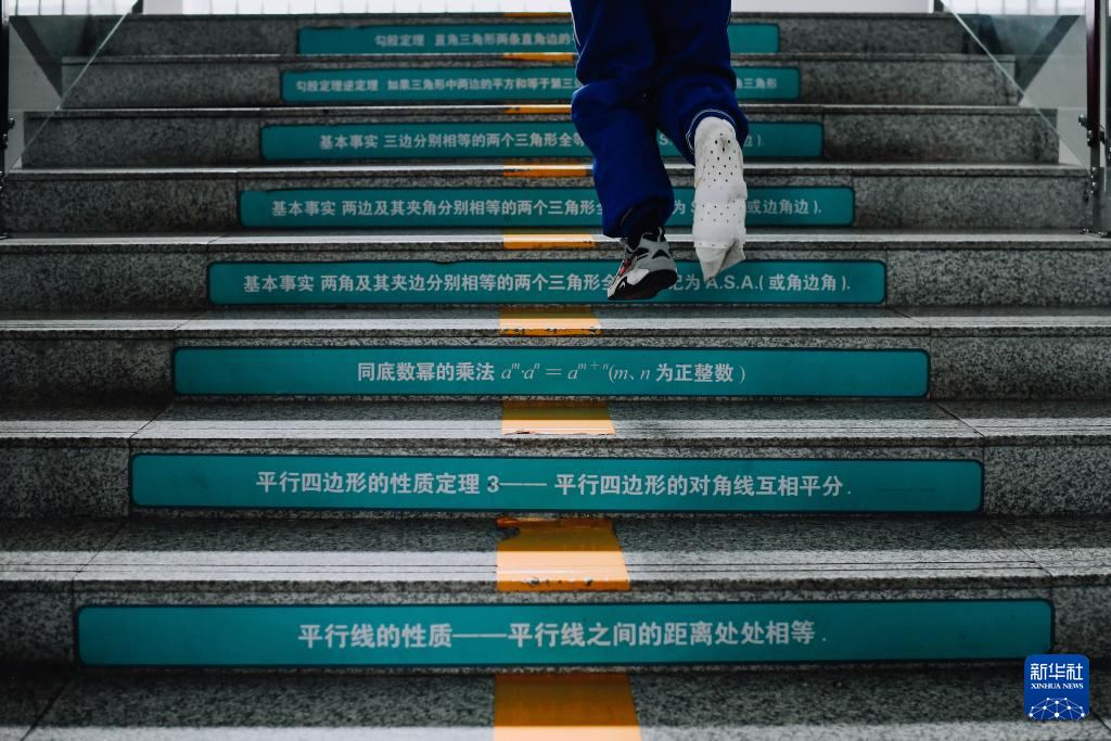 图为意外受伤后崔圣雨在教学楼单脚上楼梯(5月12日摄)。