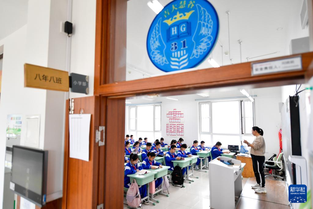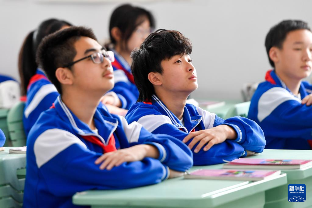 图为崔圣雨与同学在教室上课(5月12日摄)。
