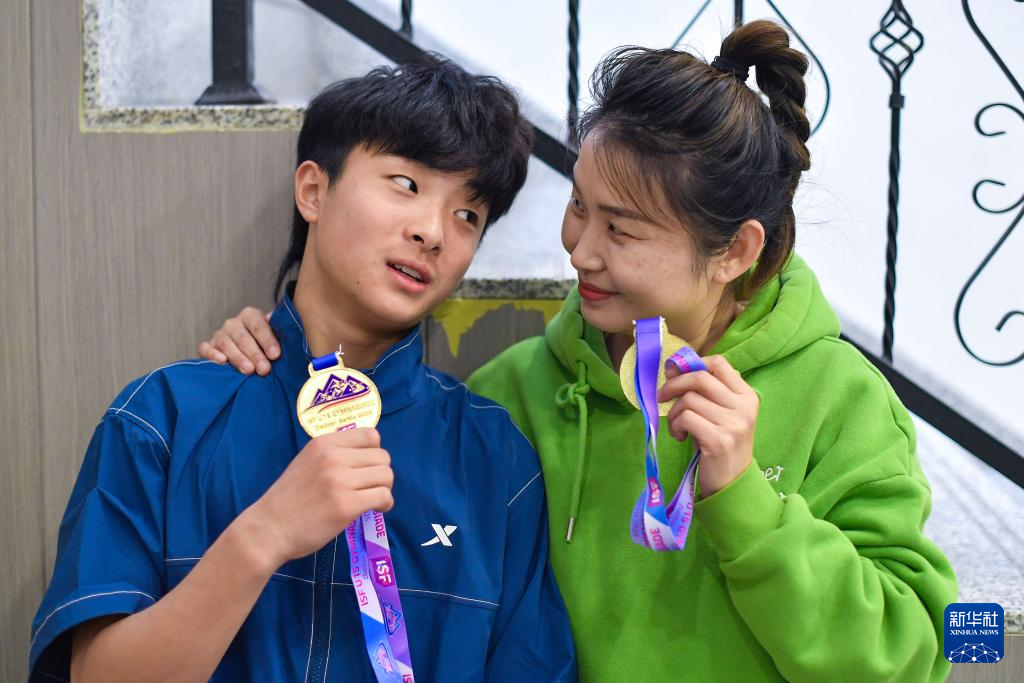图为崔圣雨(左)与母亲宋春秀手持在2025年U15世界中学生夏季运动会上收获的两枚金牌合影(5月7日摄)。