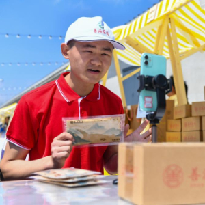 5月15日,在吉林省长春市九台区善满家园残障人综合服务中心,残障员工在网络直播间向网友介绍产品。