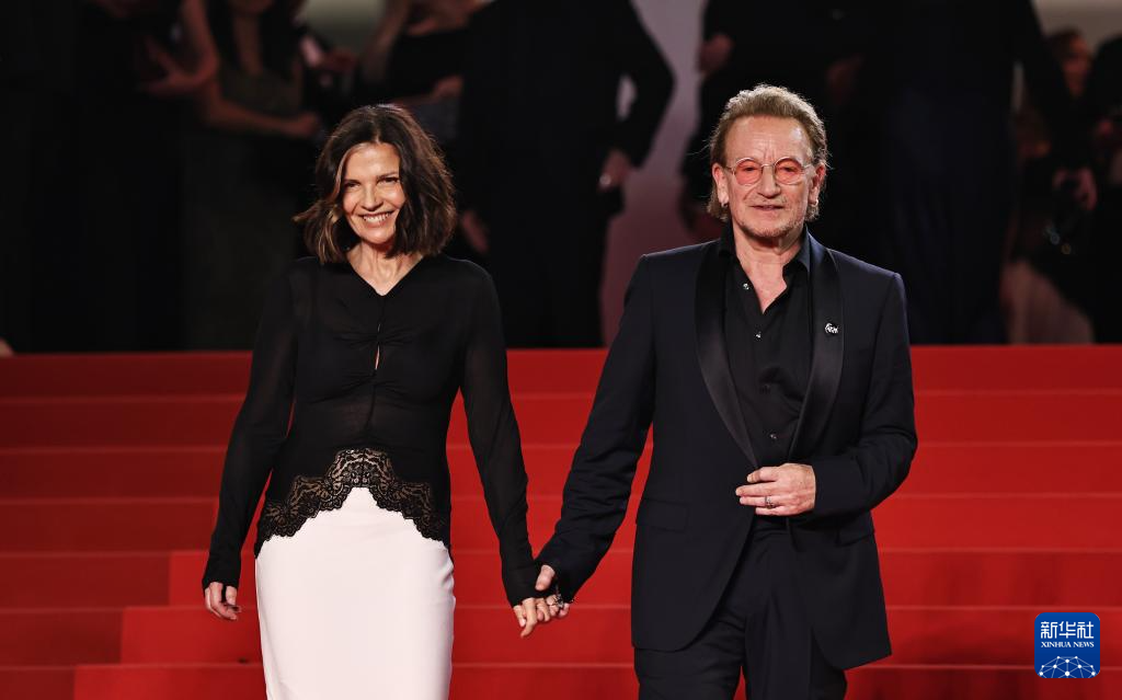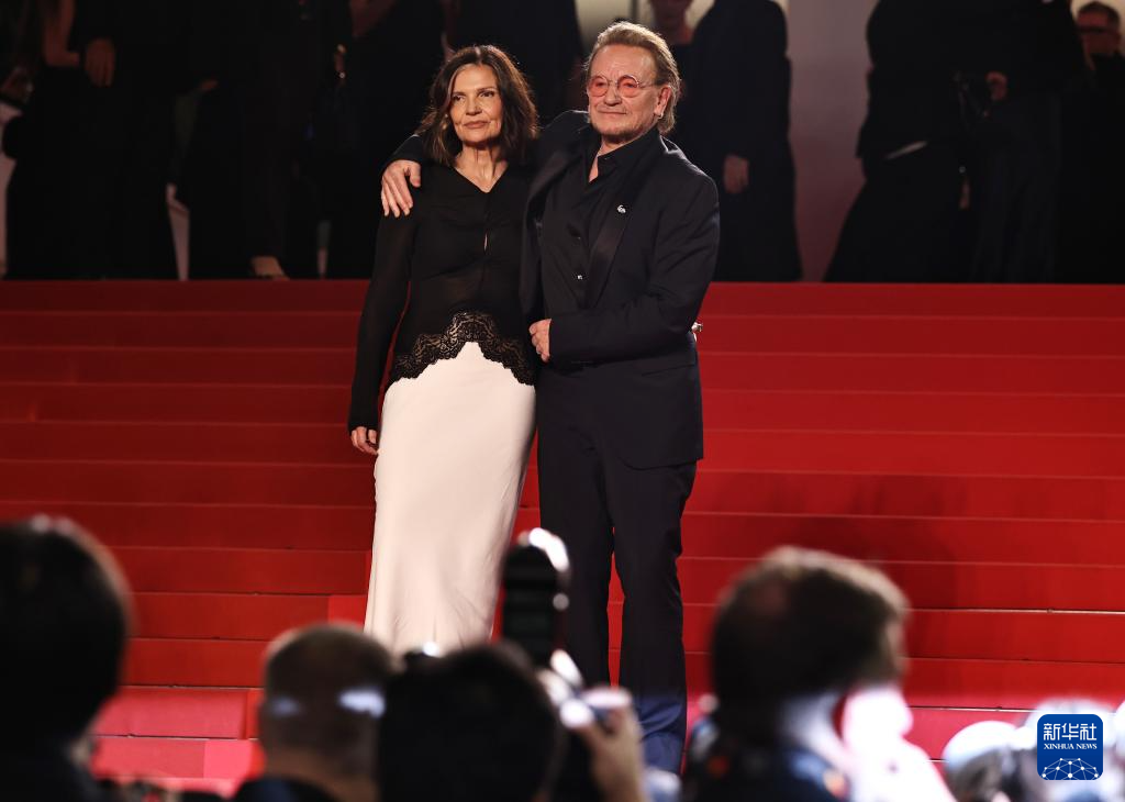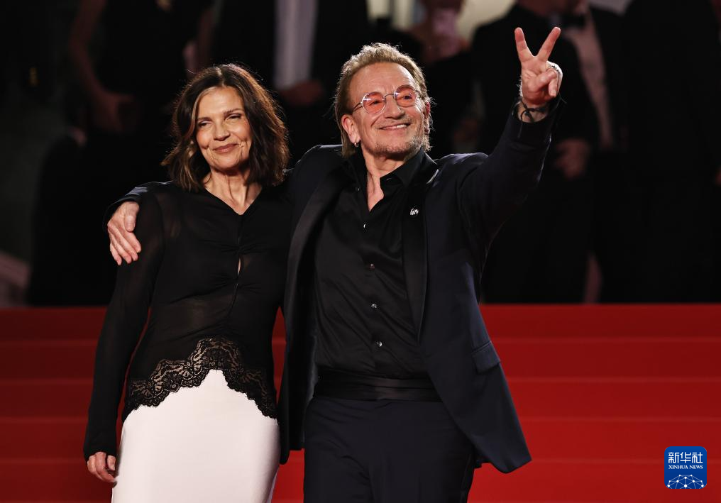 5月16日,在法国戛纳举行的第78届戛纳国际电影节上,爱尔兰摇滚乐队U2主唱波诺(右)和妻子在影片《波诺:关于投降的故事》首映后走出电影宫。