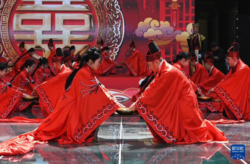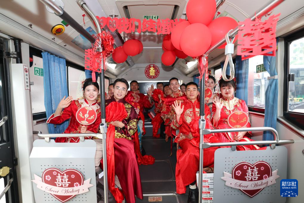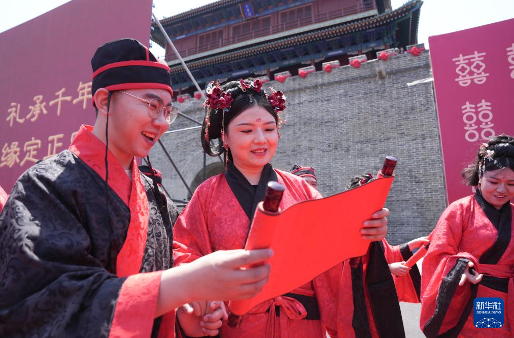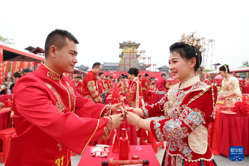 当日,多地举行传统形式的集体婚礼,倡导婚事新办简办,演绎“中式浪漫”。