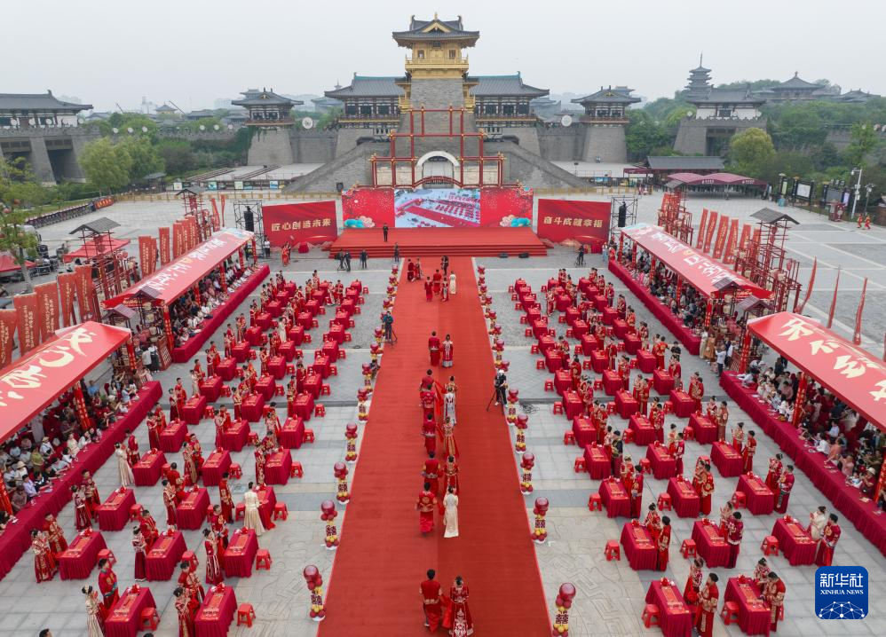 5月17日在湖北省襄阳市唐城景区拍摄的百对职工集体婚礼现场(无人机照片)。