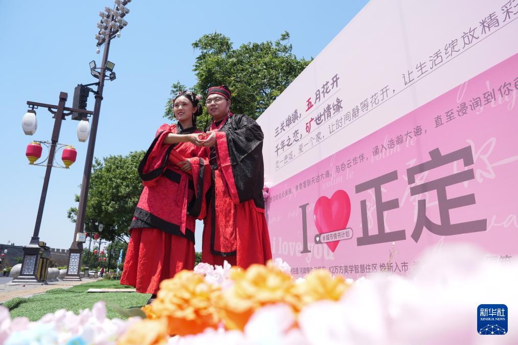 5月17日,在河北省石家庄市正定古城举行的集体婚礼上,一对新人合影留念。