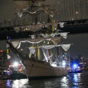5月17日,在美国纽约,救援船只抵达墨西哥海军帆船撞桥事故现场。