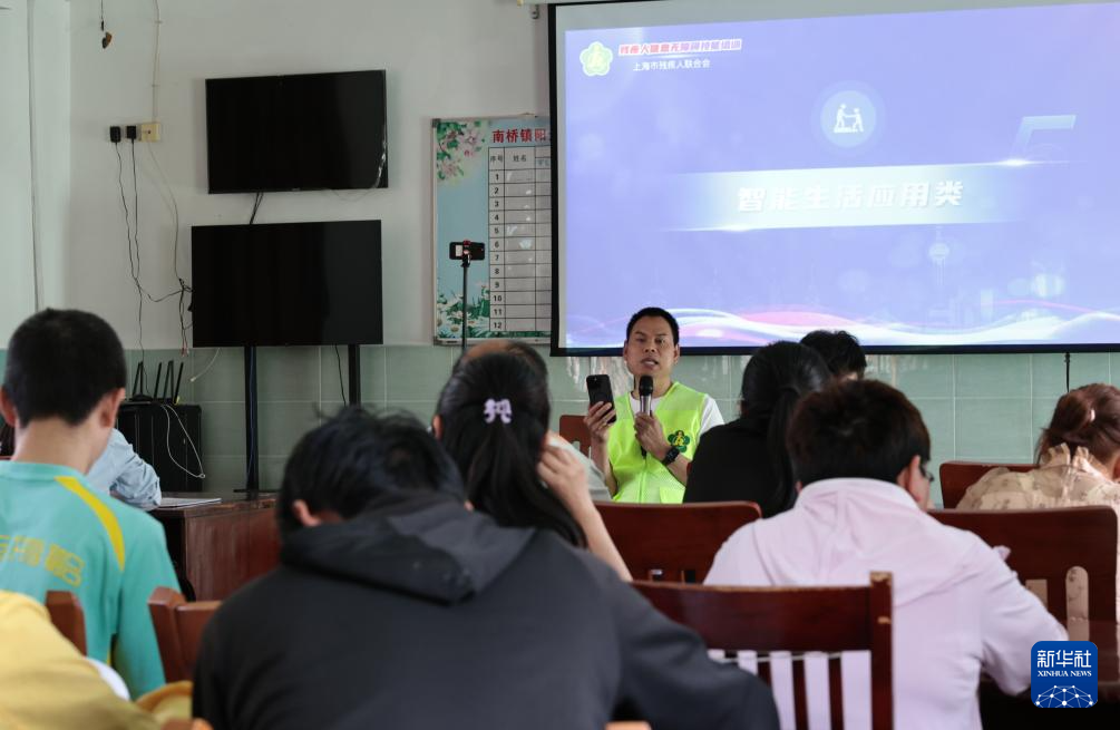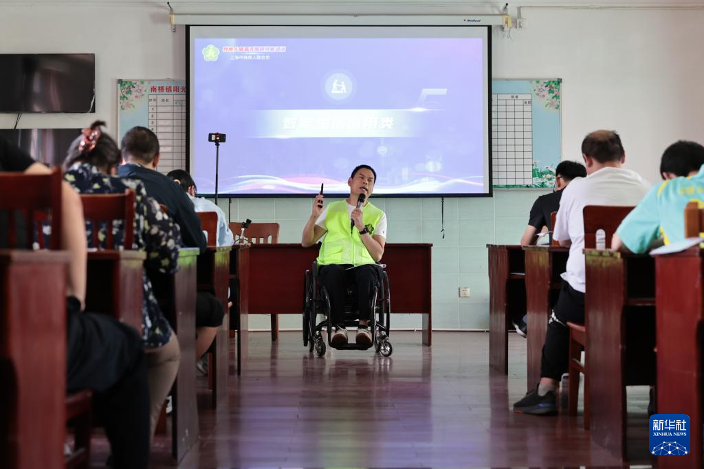5月13日,柯水昌在上海奉贤区南桥镇一个阳光之家教室内为智力障碍学员们进行智能手机使用培训。