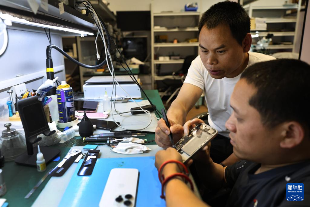 5月17日,柯水昌(左)查看朋友送修的一部摔坏的手机。