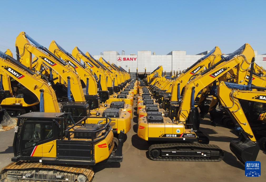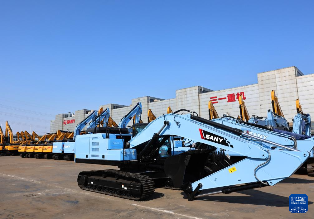 这是上海三一重机股份有限公司内等待装运的挖掘机产品。蓝色车型为出口海外的纯电挖掘机产品(4月15日摄)。