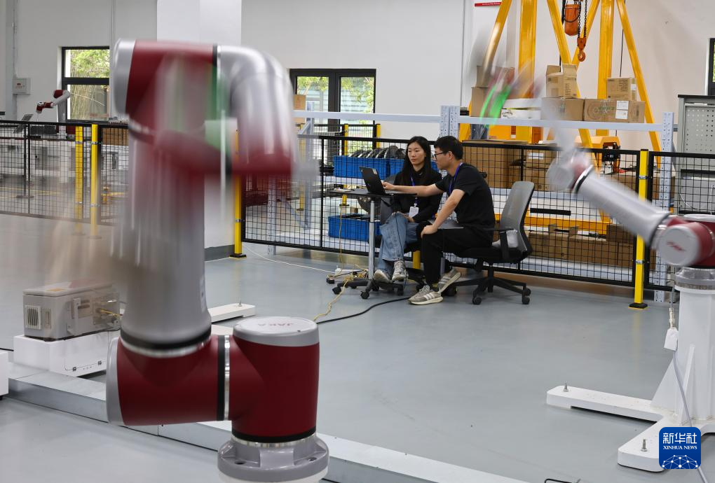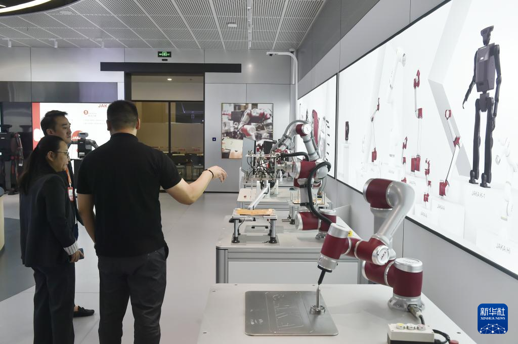 技术人员在上海节卡机器人股份有限公司的性能测试区对机器人进行测试(4月24日摄)。该公司是一家聚焦于新一代协作机器人本体与智慧工厂创新研发的高新技术企业,相关产品服务于汽车、电子、半导体等全球知名品牌的生产线,也在众多商业新消费领域从事与消费者直接接触的服务工作。