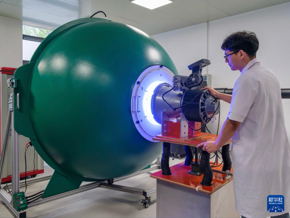 工程师在上海赛倍明照明科技有限公司的研发中心对研制的体育照明灯具进行光学色品检查(5月8日摄)。该公司集照明与物联网、人工智能等技术于一体,为体育赛事专业照明、新一代智慧型全民健身场馆照明等场景提供电气设计、智能控制、工程安装、系统调试等线上和线下解决方案。
