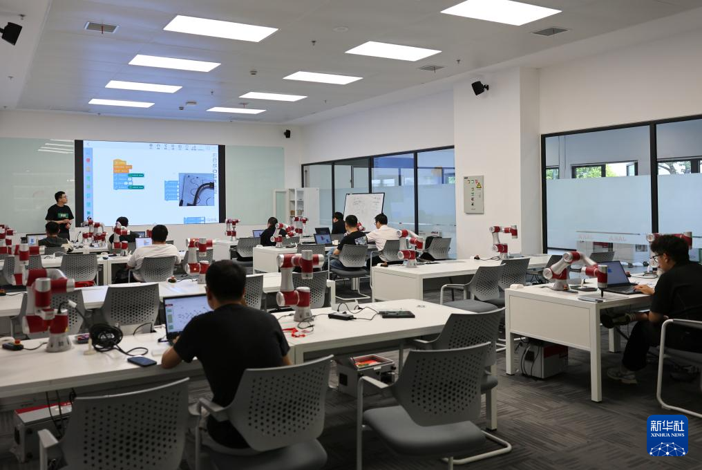 工作人员在上海节卡机器人股份有限公司的培训教室内为客户进行机器人使用教学(4月24日摄)。