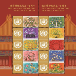 这是联合国邮政管理局于5月18日“国际博物馆日”正式发行的“故宫博物院成立100周年”特别事件邮票版张。