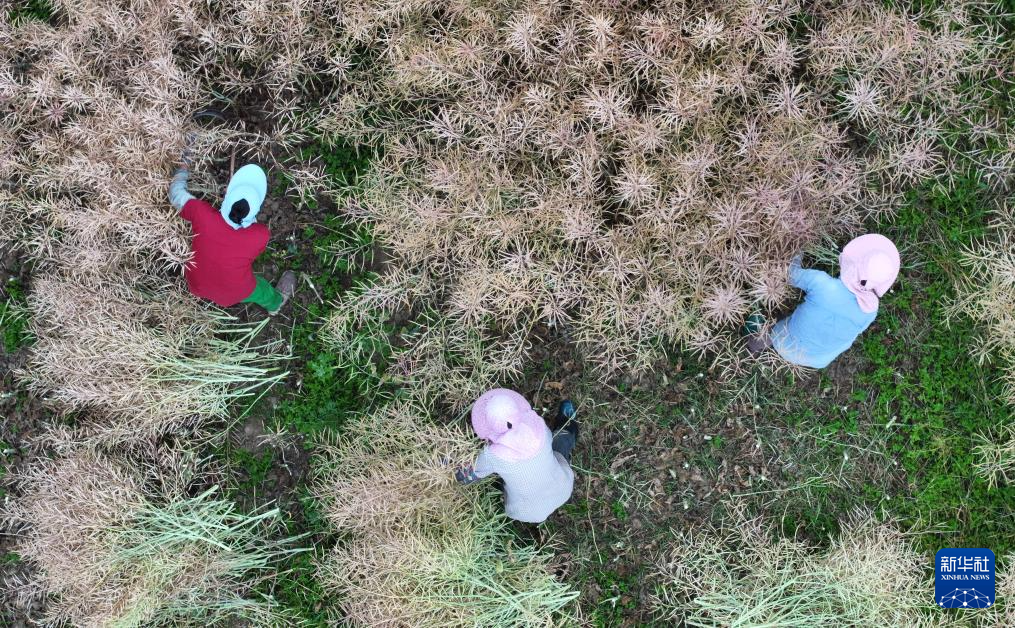 5月21日,农民在江苏里下河地区农科所(扬州市农科院)的农田里收割油菜(无人机照片)。