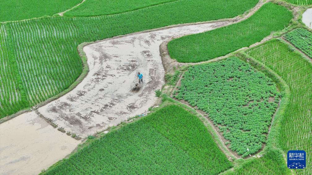 5月21日,湖南省郴州市桂阳县莲塘镇下马村农民在翻耕农田(无人机照片)。