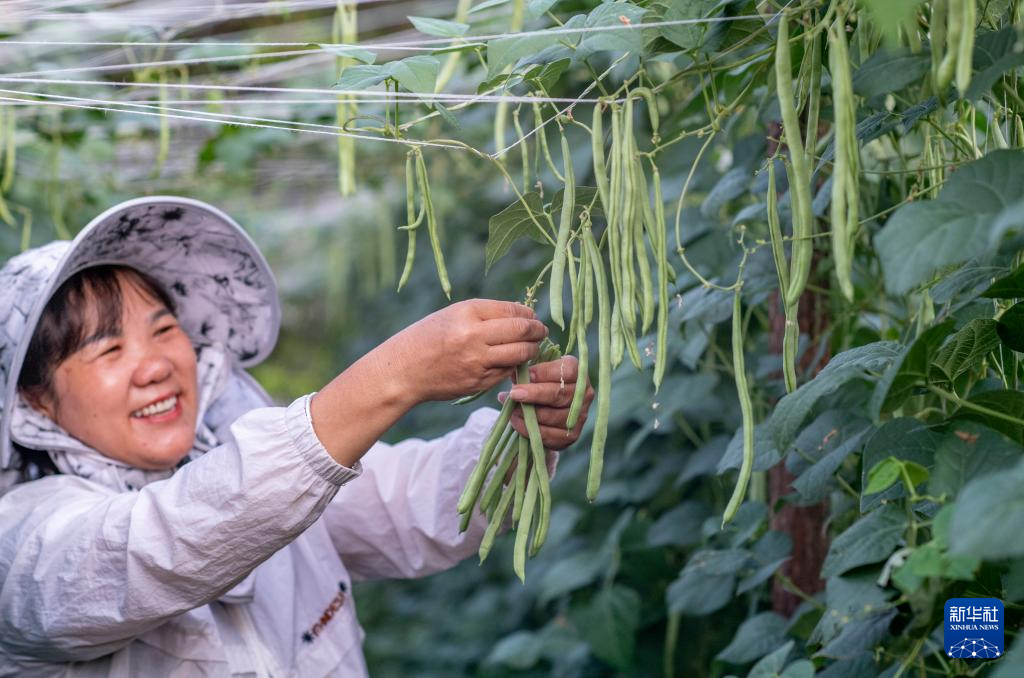 5月21日,云南省文山壮族苗族自治州文山市大石洞村农民在蔬菜基地采摘豆角。