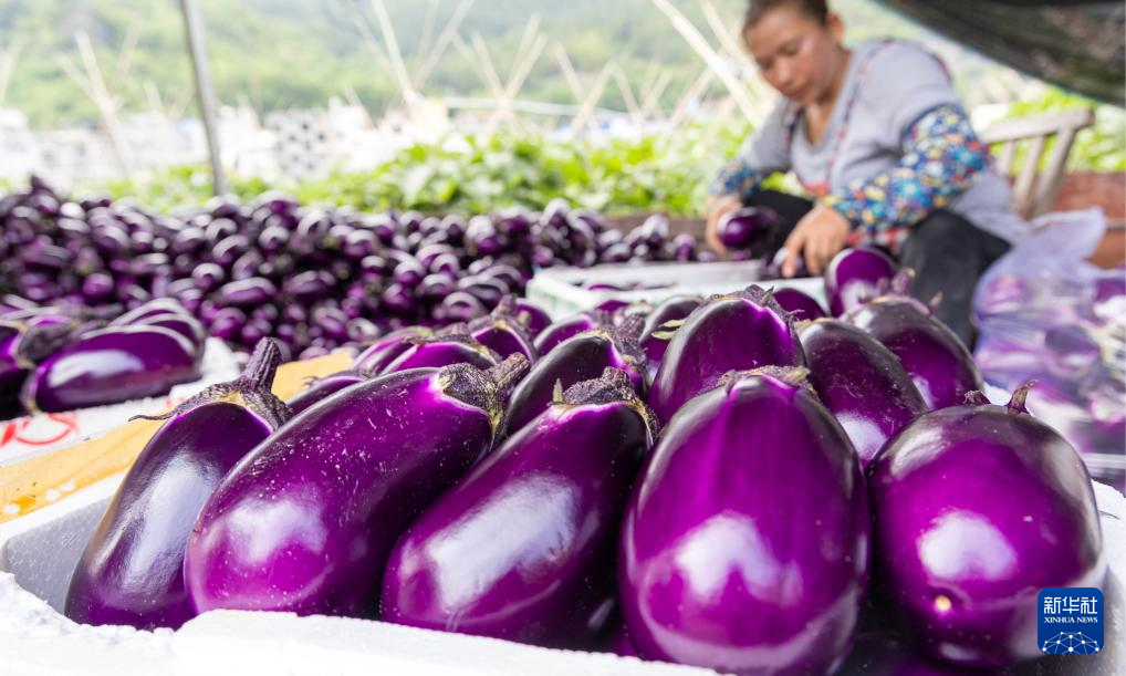 5月21日,村民在贵州省黔南布依族苗族自治州罗甸县龙坪镇罗化村分拣茄子。