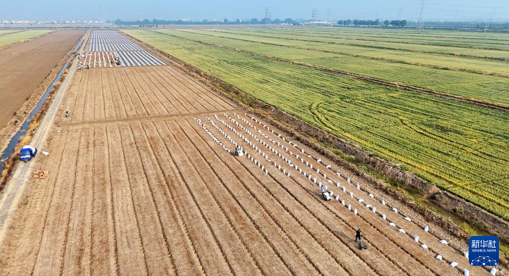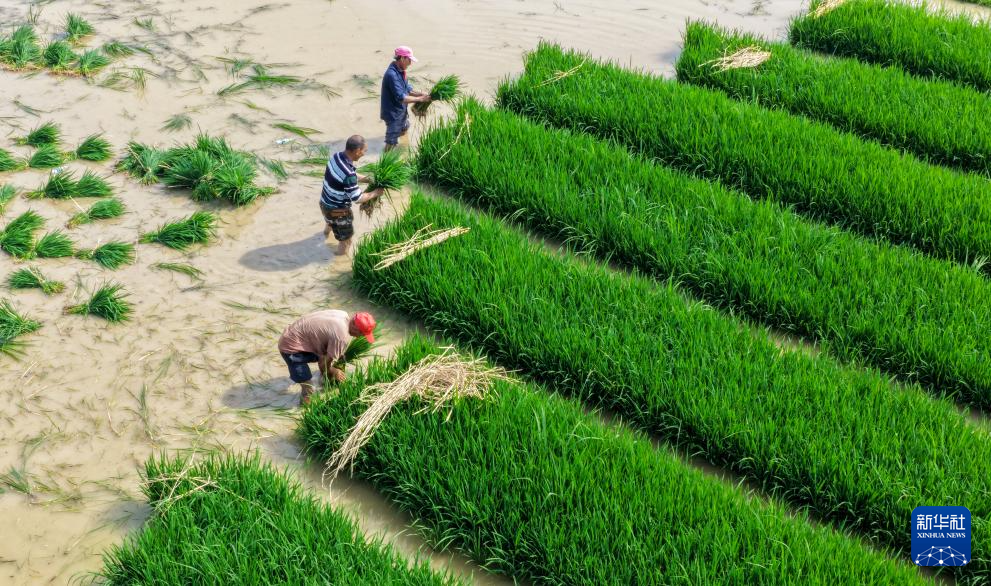 5月21日,河北省唐山市丰南区西葛镇西葛村农民在田间搬运水稻秧苗(无人机照片)。