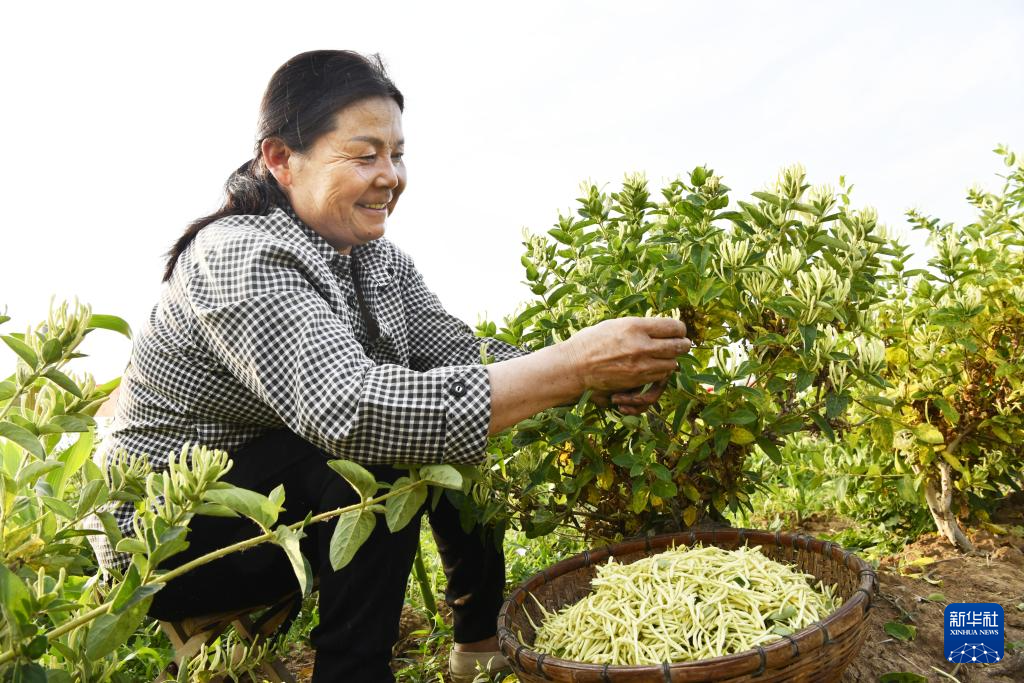 5月21日,山东省枣庄市山亭区蒋沟村农民在采摘金银花。