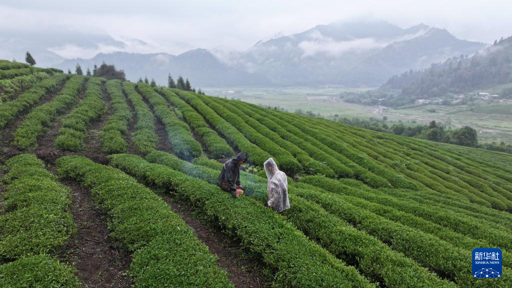 5月21日,在云南省腾冲市明光镇自治村乌龙坝生态茶园,茶农手持便携式采茶机在采摘乌龙茶(无人机照片)。