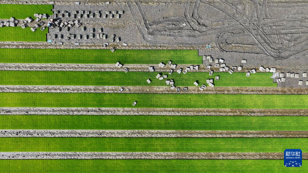 5月21日,江苏省连云港市工投集团青口投资有限公司大新农场秧板田里,种植户进行耐盐碱水稻集中育秧作业(无人机照片)。