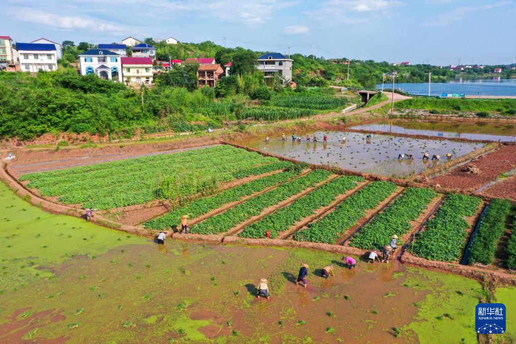 5月21日,湖南省衡阳市衡东县高湖镇村民在插秧(无人机照片)。