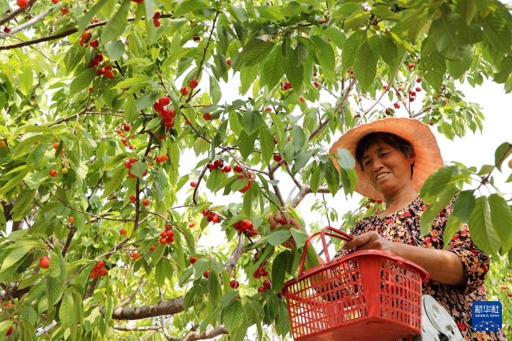 5月21日,在山东省滨州市博兴县庞家镇一处高效生态农业示范园,农民在采摘樱桃。
