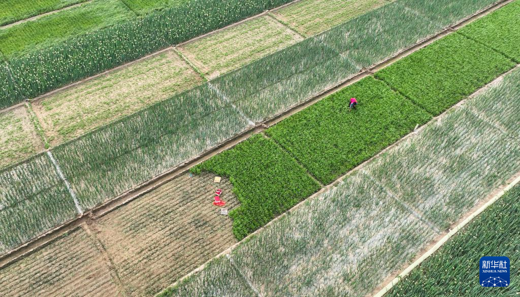 5月21日,在山东省青州市黄楼街道孙家村,农民在管护大葱。