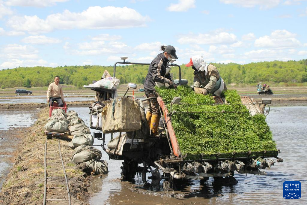 5月21日,北大荒集团黑龙江建设农场有限公司第四管理区种植户在利用“小火车”运输稻苗,提升插秧进度。