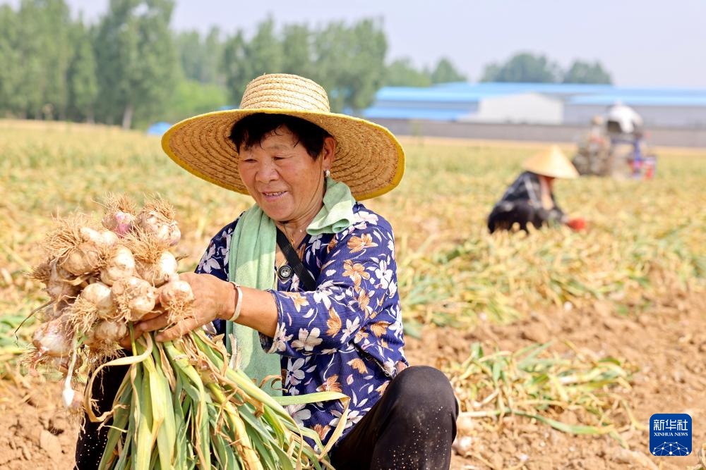 5月21日,山东省枣庄市市中区税郭镇纪官庄村农民在田间收获大蒜。