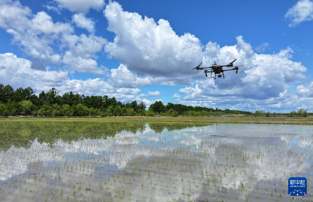 5月21日,在黑龙江北大荒农业股份八五六分公司第六管理区农业现代化示范区,搭载多光谱、可见光摄像头的无人机对水稻插秧后田块进行土壤墒情监测(无人机照片)。