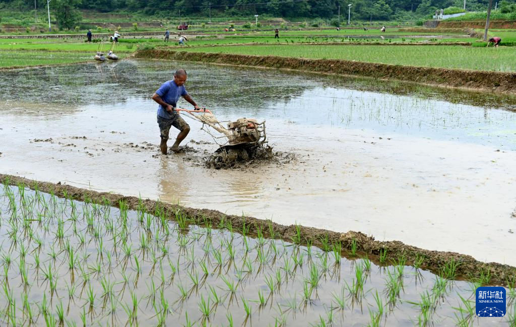 5月21日,在湖南省邵阳市洞口县黄桥镇双竹村,农民驾驶微耕机翻耕水田。