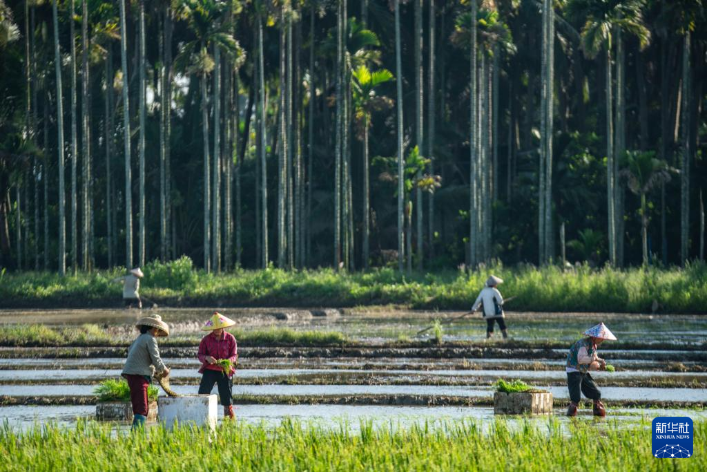5月21日,海南省琼海市嘉积镇的农民在田间插秧。