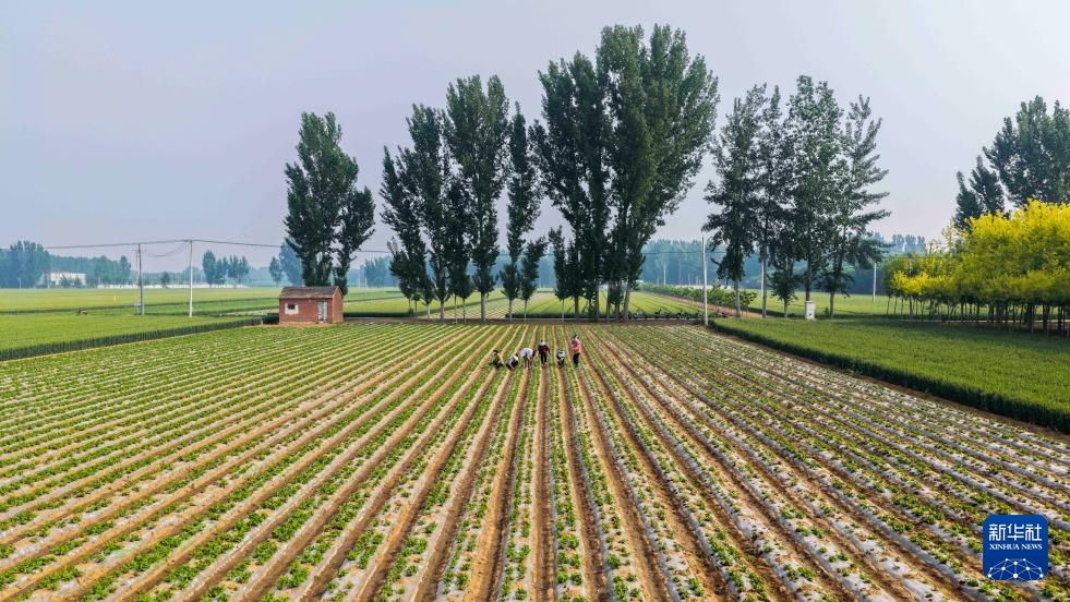 5月21日,农户在河北省石家庄市藁城区常安镇里庄村田地忙碌(无人机照片)。