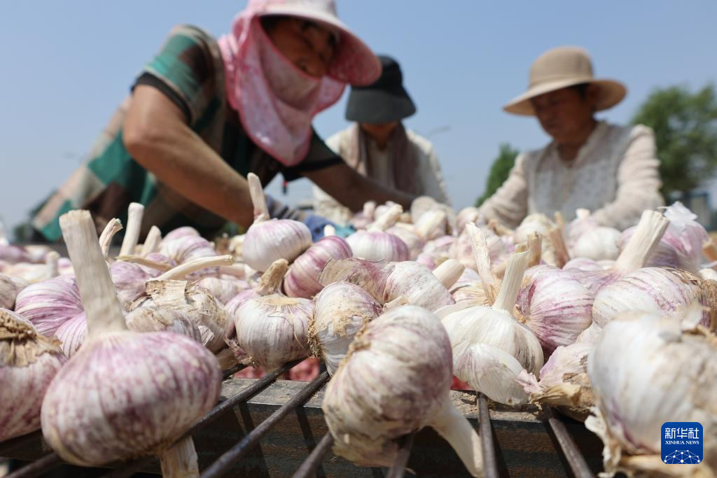 5月21日,河南省开封市城乡一体化示范区水稻乡南北堤社区的蒜农将晒好的大蒜分拣装袋。