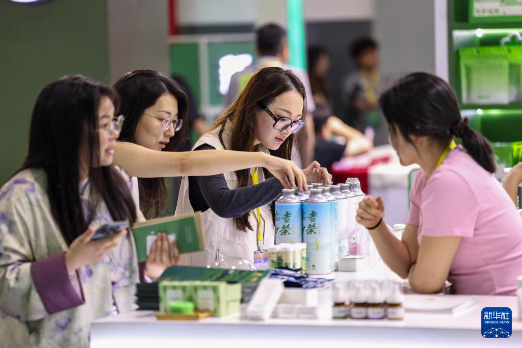 5月21日,观众在第七届中国国际茶叶博览会现场挑选安吉白茶茶饮。