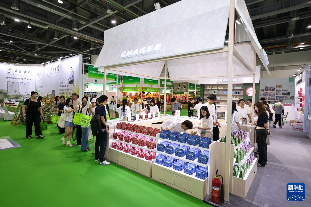 5月21日,观众在第七届中国国际茶叶博览会现场参观一家茶饮企业展区。