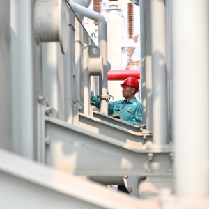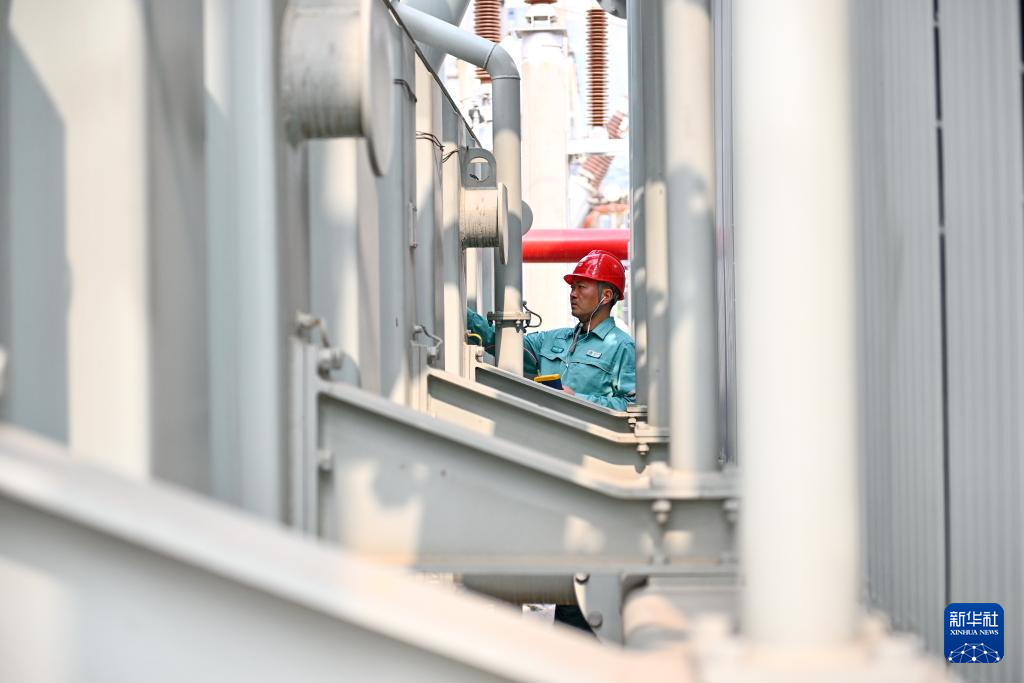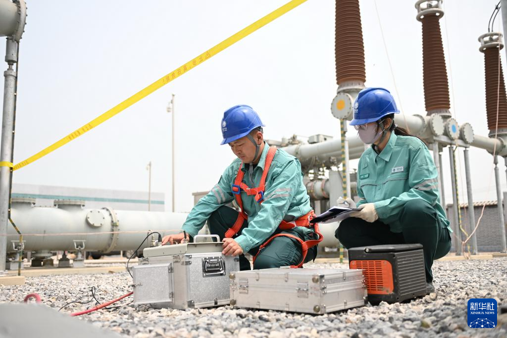 5月21日,冯正军(左)在位于保定市高阳县的国网王庄220千伏变电站内进行电气试验。