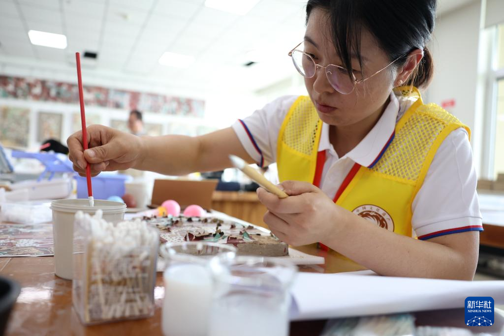 5月22日,来自宁夏回族自治区博物馆的参赛选手李琦在陶瓷文物修复比赛中。