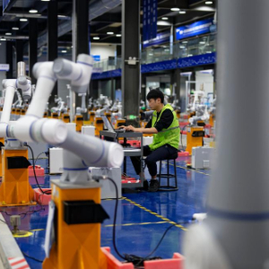 5月24日,工作人员在山东省日照市经济技术开发区越疆机器人日照生产基地对机械臂产品进行测试。