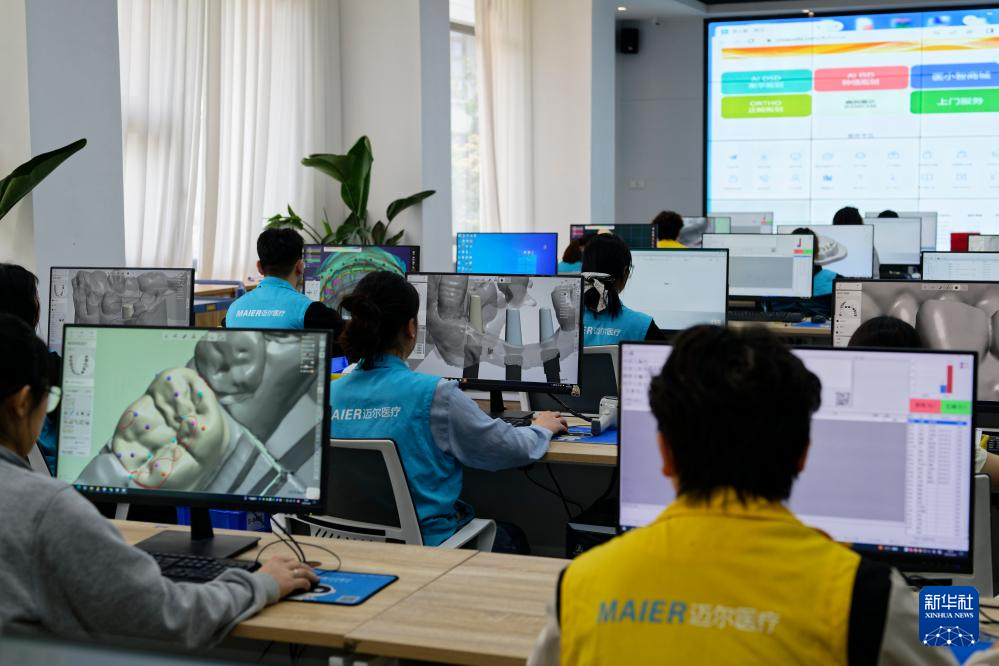 5月24日,设计人员在山东省日照市高新区山东迈尔医疗科技有限公司数据中心根据口腔门诊扫描上传数据设计牙齿模型。