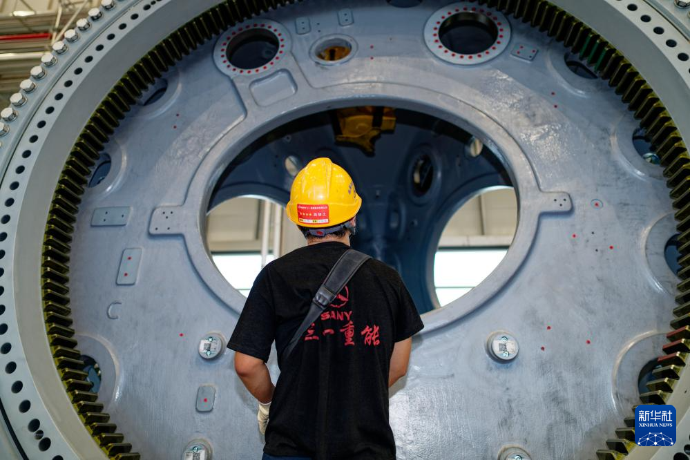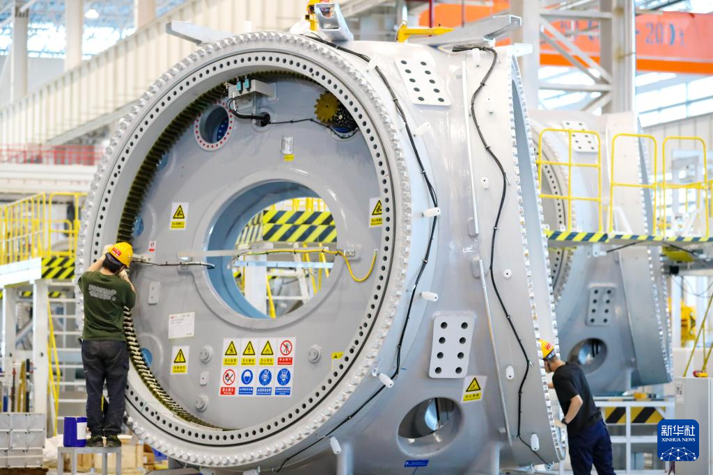 5月24日,工作人员在山东省日照市经济技术开发区三一重能(日照)风电智能制造基地进行装吊风力发电机轮毂作业。