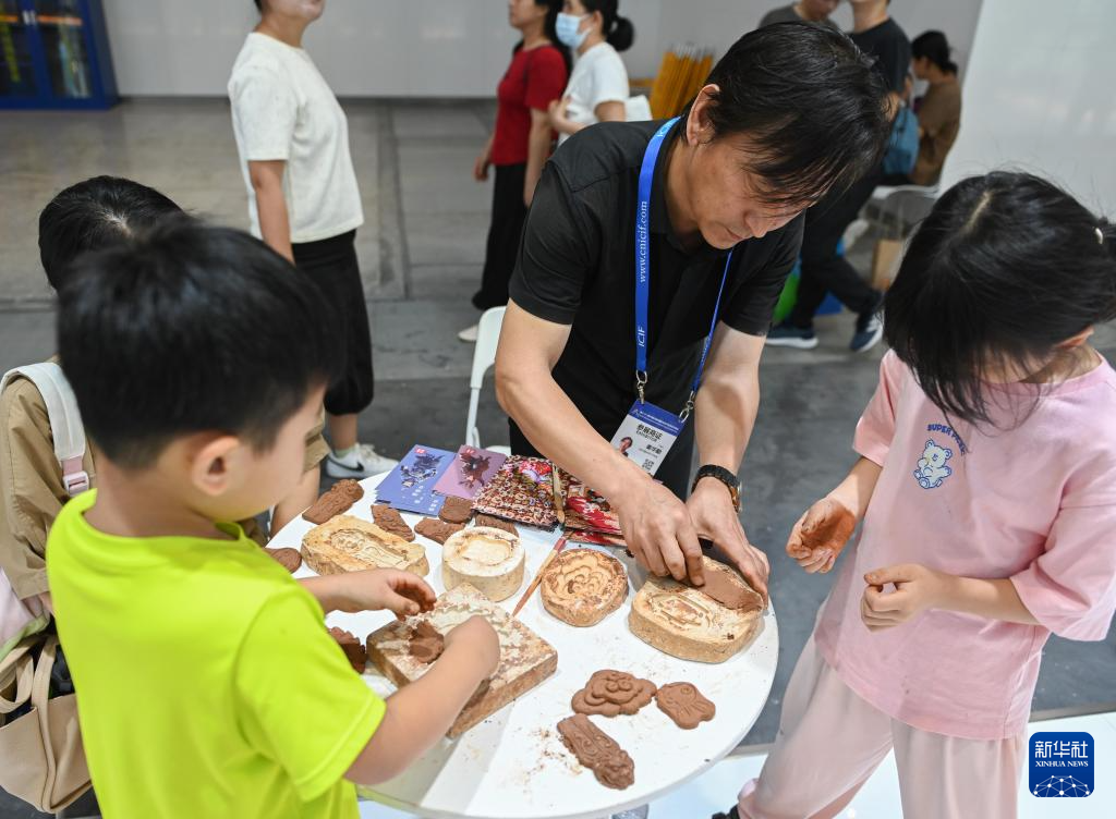 5月24日,在文博会山西展区,彩塑艺术家教儿童制作泥塑。