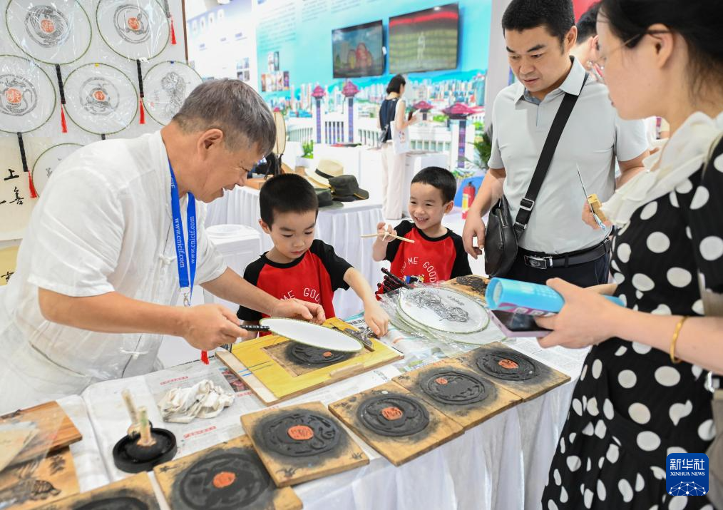 5月24日,在文博会江西展区,儿童体验雕版翻墨技艺。