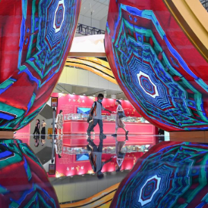 5月24日,在文博会北京展区,儿童经过北京中轴线展示屏。