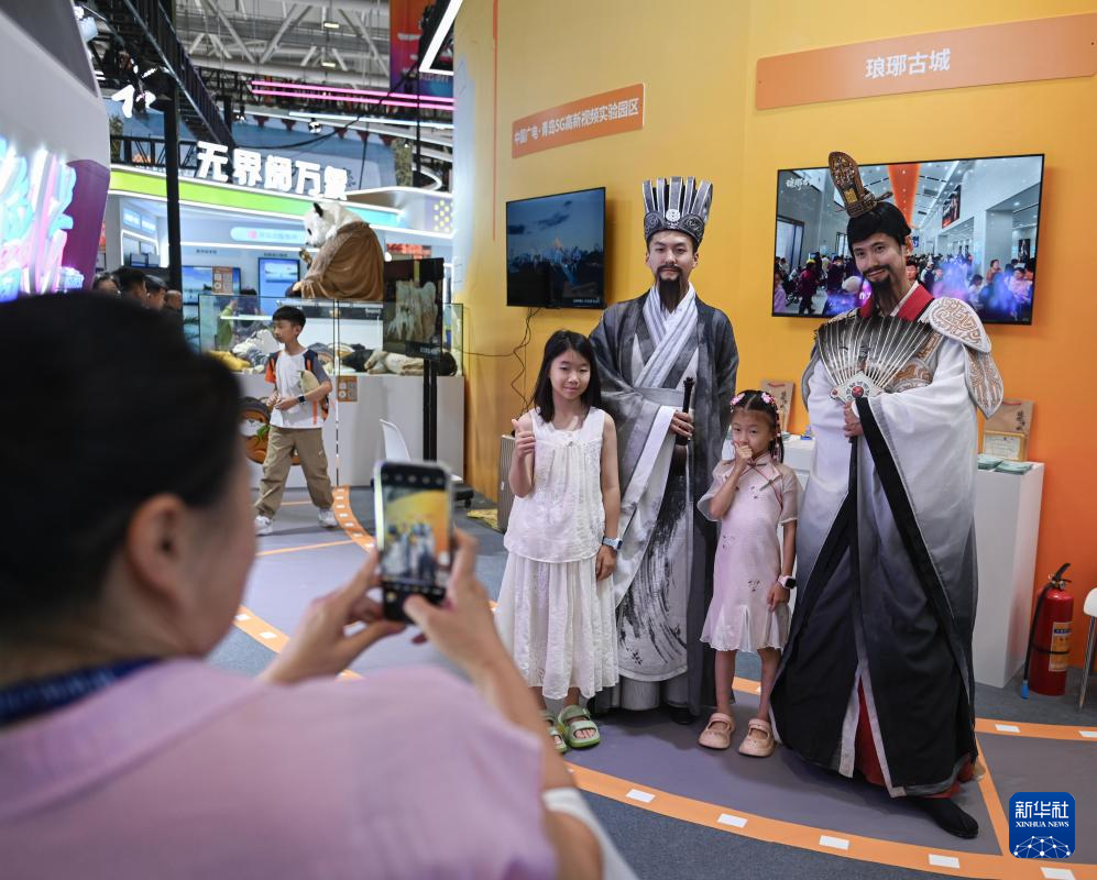 5月24日,在文博会山东展区琅琊古城展台,儿童与王羲之、诸葛亮扮演者合影。