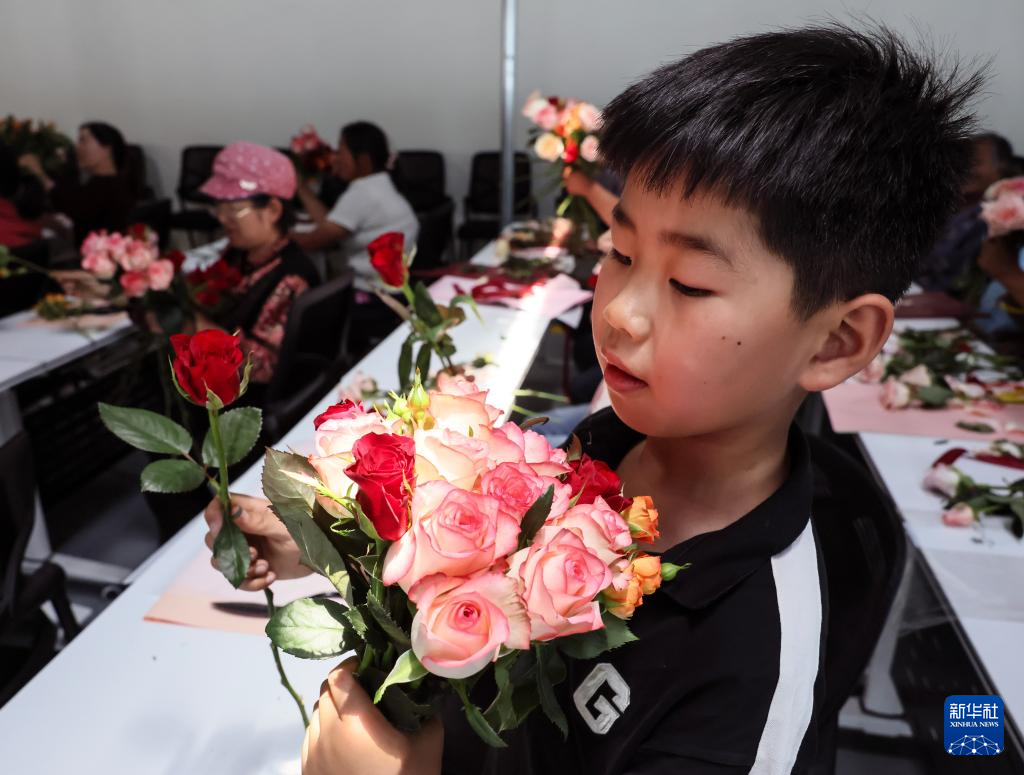 5月24日,在莒县招贤镇小罗庄村的田间课堂内,一名小朋友在插花艺术特色技能培训班上学习插花技艺。