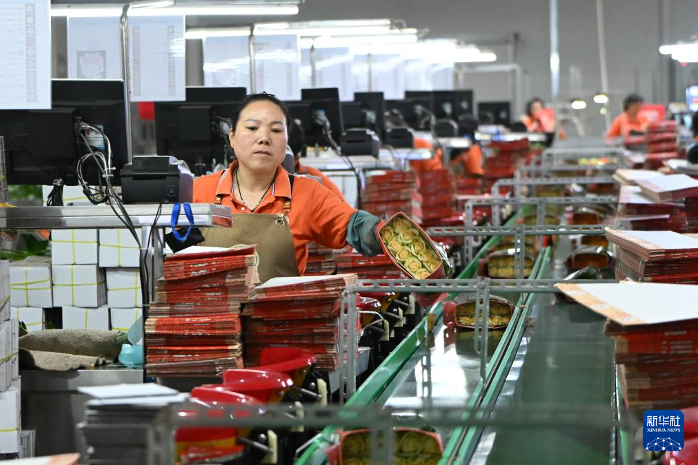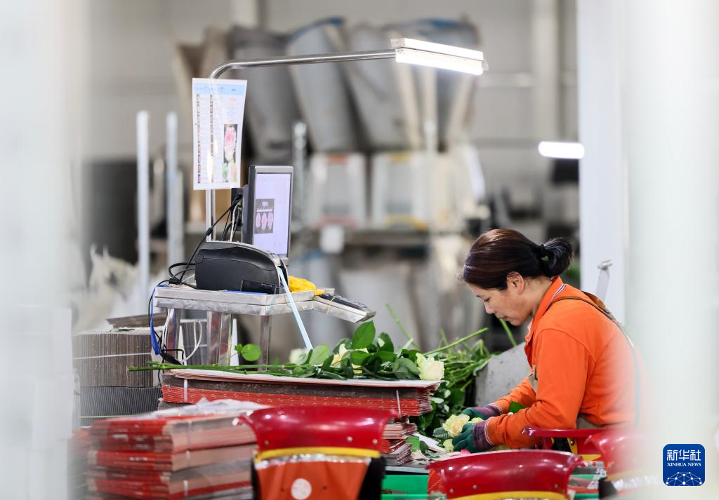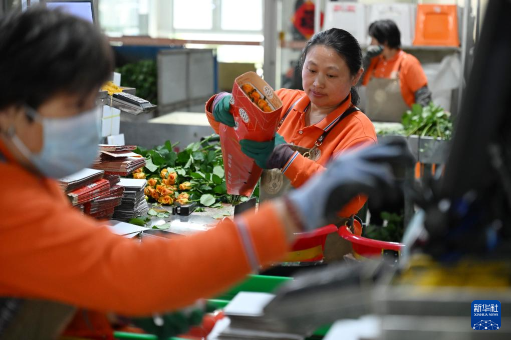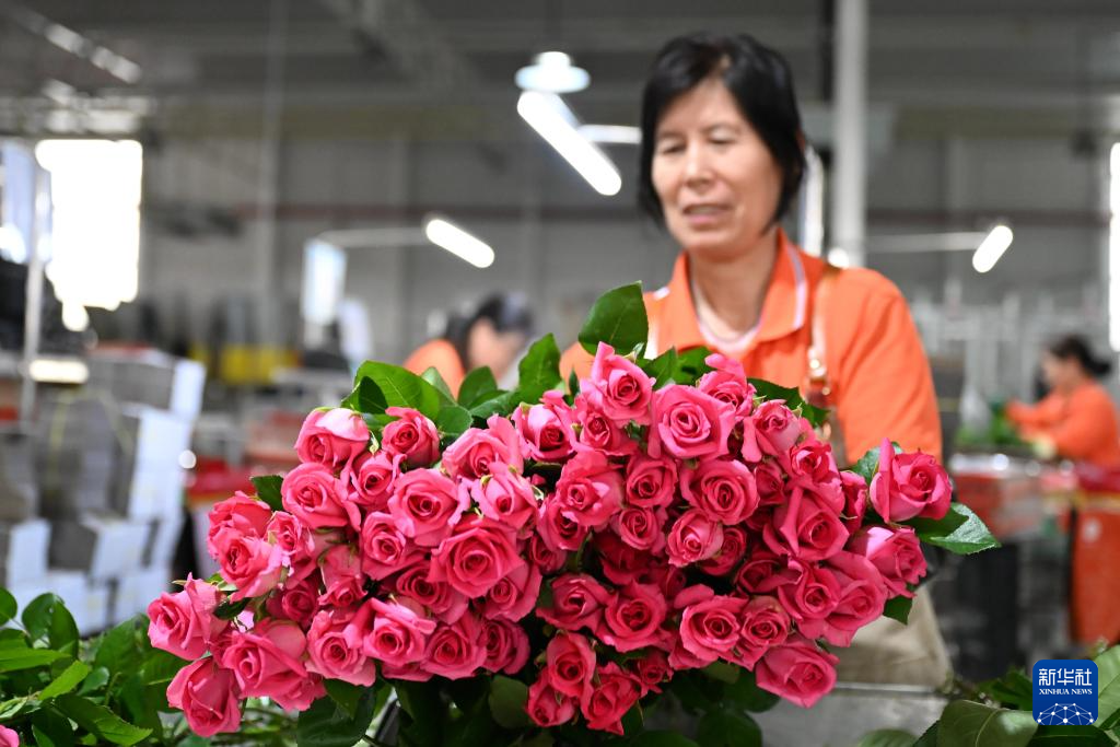 5月24日,在莒县招贤镇曲坊现代农业产业园的鲜切花包装车间,工人在包装鲜切玫瑰花。