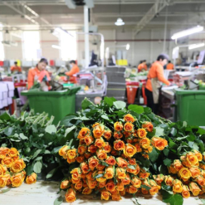 5月24日,在莒县招贤镇曲坊现代农业产业园的鲜切花包装车间,工人在分拣处理鲜切玫瑰花。
